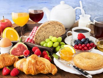 Bagel, croissant, Multigrain bread, sliced loaf cake, and fresh fruit platter