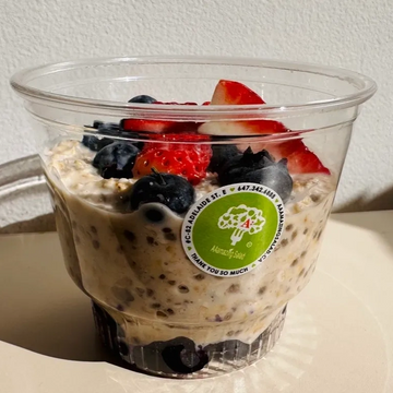 Oats, chia seeds, almond milk, maple syrup, fruits